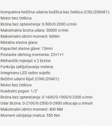 Tip proizvoda: Bušilica i odvijač; Tip: AKU; Napon: 20 V; Model: CKLI20275E; Baterija: 2 x...